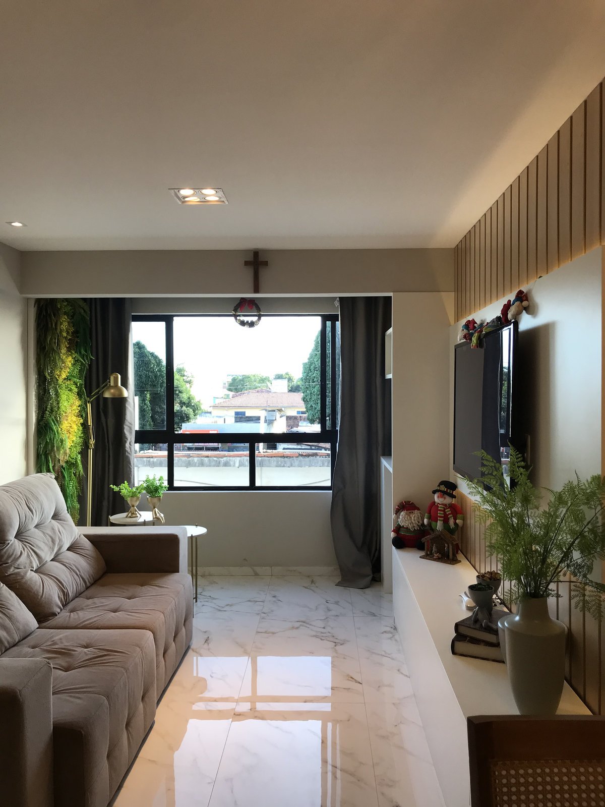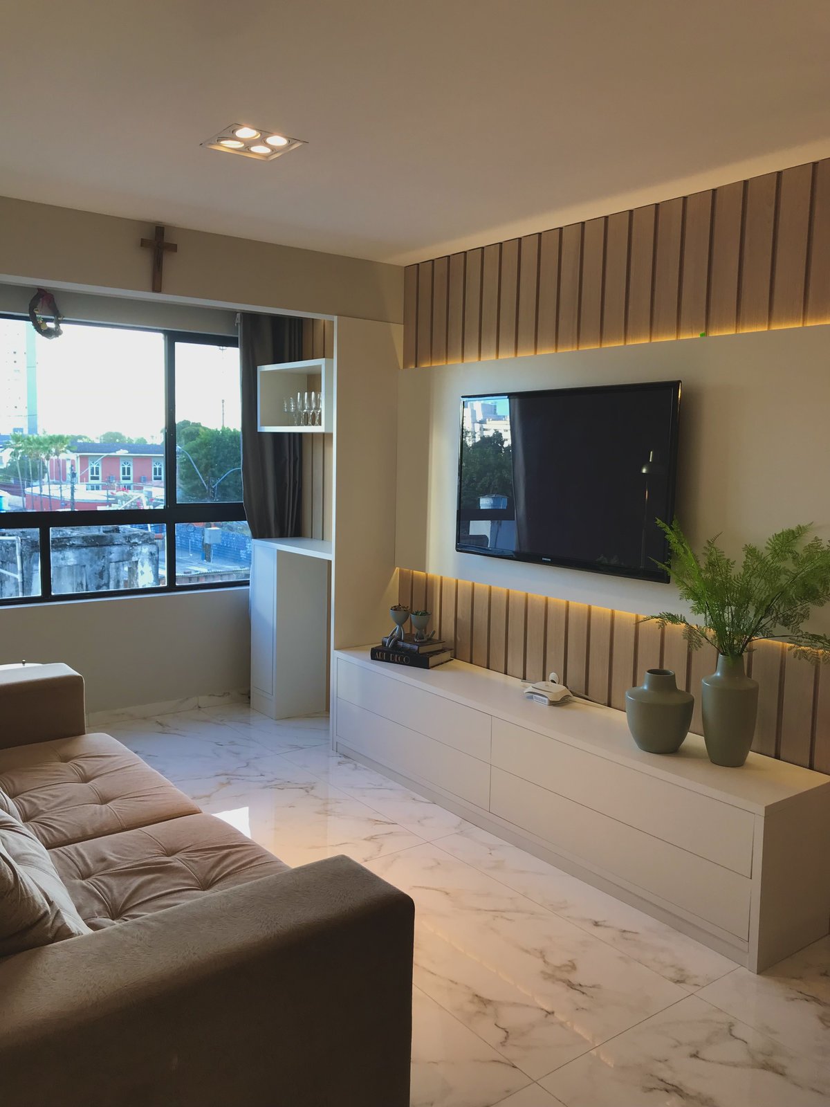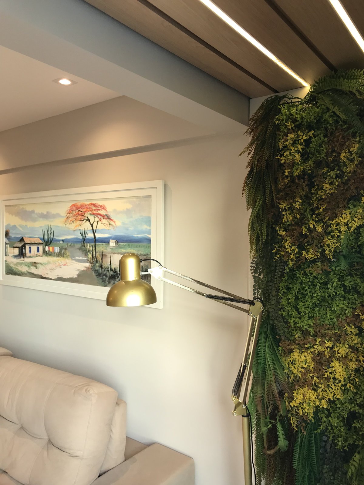 Um refúgio urbano elegante e funcional. Painel ripado com LED, marcenaria sob medida e tons neutros criam um living sofisticado e acolhedor. O jardim vertical traz frescor e conexão com a natureza, enquanto os detalhes dourados e o forro iluminado completam o ambiente com charme e modernidade.